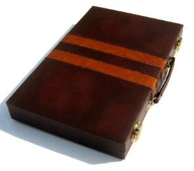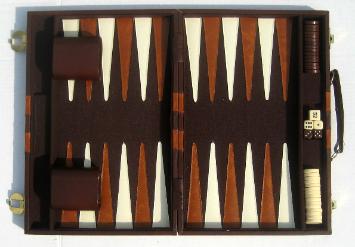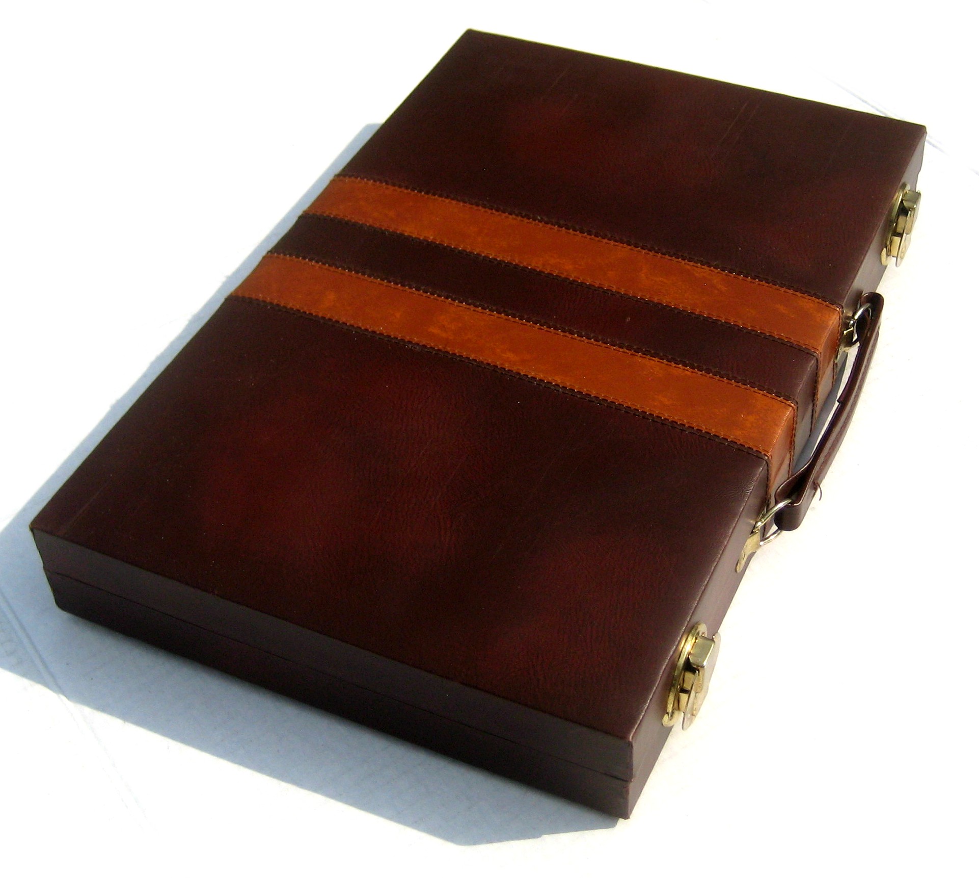 Backgammon Leatherette Full Size Case Set (Cloth Interior) ©No Date, Unknown Publisher Ages: Teen to Adult Players: 2 |