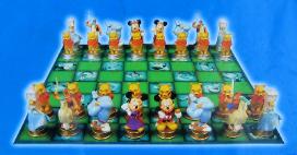 | 1 Chess/Checkers game board 32 Plastic Chess pieces (see listing below) 16 Gold (base) playing pieces 16 Silver (base) playing pieces 32 Plastic Checker pieces 16 Red playing pieces 16 Blue playing pieces Rules Gold (Base) Set Listing 1 Mickey Mouse King 1 Minnie Mouse Queen 2 Cinderella Towers (Rooks) 2 Genie Bishops 2 Hercules Knights 8 Pooh Pawns Silver (Base) Set Listing 1 Mickey Mouse King 1 Minnie Mouse Queen 2 Cinderella Towers (Rooks) 2 Genie Bishops 2 Hercules Knights 8 Pooh Pawns |