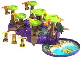 | 1 Electronic jungle base (with cardboard beach) 8 Plastic tree tops 2 Large tree tops 6 Small tree tops 8 Plastic tree trunks 4 Large tree trunks 4 Small tree trunks (with 4 plastic leaf levers) 10 Jungle animals 5 Orange stand-up animals 5 Yellow stand-up animals 1 Plastic palm tree 2 Plastic barriers Rules |