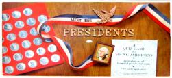 | 1 Game board (with 4 colored sections) 1 Giant Q & A Spinner (with 128 questions) 1 Cardboard coin holder (for 35 coins) 35 Metal Presdiential coins (X) = Bonus Coin George Washington John Adams Thomas Jefferson James Madison James Monroe John Quincy Adams Andrew Jackson Martin Van Buren William Harrison John Tyler James Polk Zachary Taylor Millard Fillmore Franklin Pierce James Buchanan Abraham Lincoln Andrew Johnson Ulysses Grant Rutherford Hayes James Garfield Chester Arthur Grover Cleveland Benjamin Harrison William McKinley Theodore Roosevelt William Taft Woodrow Wilson Warren Harding Calvin Coolidge Herbert Hoover Franklin Roosevelt Harry Truman Dwight Eisenhower (X) John Kennedy (X) Lyndon Johnson (X) Rules |