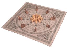| DESCRIPTION - from the game Noble Celts is a circular chess boardgame that plays like standard Chess. This game has 64 circles that correspond to the 64 squares of standard chess. The cloth game board has diagonal lines which spiral into and out of the center. Pieces are placed on the perimeter of the circular game board and in the center ring. Players move inward and outward from the center. |