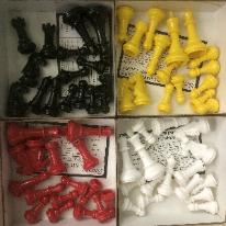 | 9 Game board (each different) 4 Sets of playing pieces (See list below) 1 Red set 1 Black set 1 White set 1 Yellow set Rules Each set contains 1 King 1 Queen 2 Bishops 2 Knights 2 Rooks 8 Pawns |