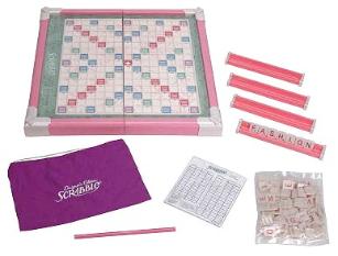 | DESCRIPTION - from the game A Timeless Classic ...With a Modern Makeover! It has style, it has taste - and elegant accessories like a pastel rotating gameboard, pearlescent letter tiles, and embroidered fabric pouch. All the fashionable game pieces are designed with a woman in mind, but with the same SCRABBLE challenge you know and love! Just choose 7 of the unique looking letter tiles, and start spelling - this Designer's Edition has a flair for F-U-N! Shipping Wt: Approx. 5 lbs. |