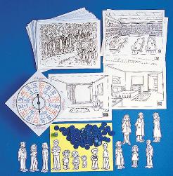 | 20 Picture scene cards (#1 to #24, except blank cards) 4 Blank cards ( # 6, 9, 19, 23) 1 Spinner 30 Figure cards 15 Caucasian figure cards 6 Black figure cards 6 Hispanic figure cards 3 Asian figure cards 60 Plastic reward chips 1 Standard 6-sided die Rules |