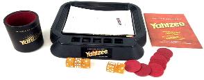 | DESCRIPTION - from the game Shake 5-clear, golden-flecked dice in the plush cup. Roll them into the sleek, felt-lined tray. Place "keepers" in the handy dice holders. If you roll a bonus Yahtzee, take an exclusive token. Keep score with deluxe Yahtzee pencils. For elegance and style, you just can't play a better game of Yahtzee. Shipping Wt: Approx. 2 lbs. |