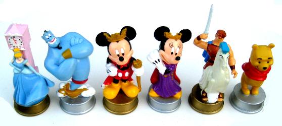 | 1 Chess/Checkers game board 32 Plastic Chess pieces (see listing below) 16 Gold (base) playing pieces 16 Silver (base) playing pieces 32 Plastic Checker pieces 16 Red playing pieces 16 Blue playing pieces Rules Gold (Base) Set Listing 1 Mickey Mouse King 1 Minnie Mouse Queen 2 Cinderella Towers (Rooks) 2 Genie Bishops 2 Hercules Knights 8 Pooh Pawns Silver (Base) Set Listing 1 Mickey Mouse King 1 Minnie Mouse Queen 2 Cinderella Towers (Rooks) 2 Genie Bishops 2 Hercules Knights 8 Pooh Pawns |