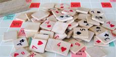 | 1 Playing board 4 Tile racks (9 inch) 54 Wooden tiles 52 Standarad card deck tiles 2 Joker tiles 1 Cloth pouch Rules (under cover) |