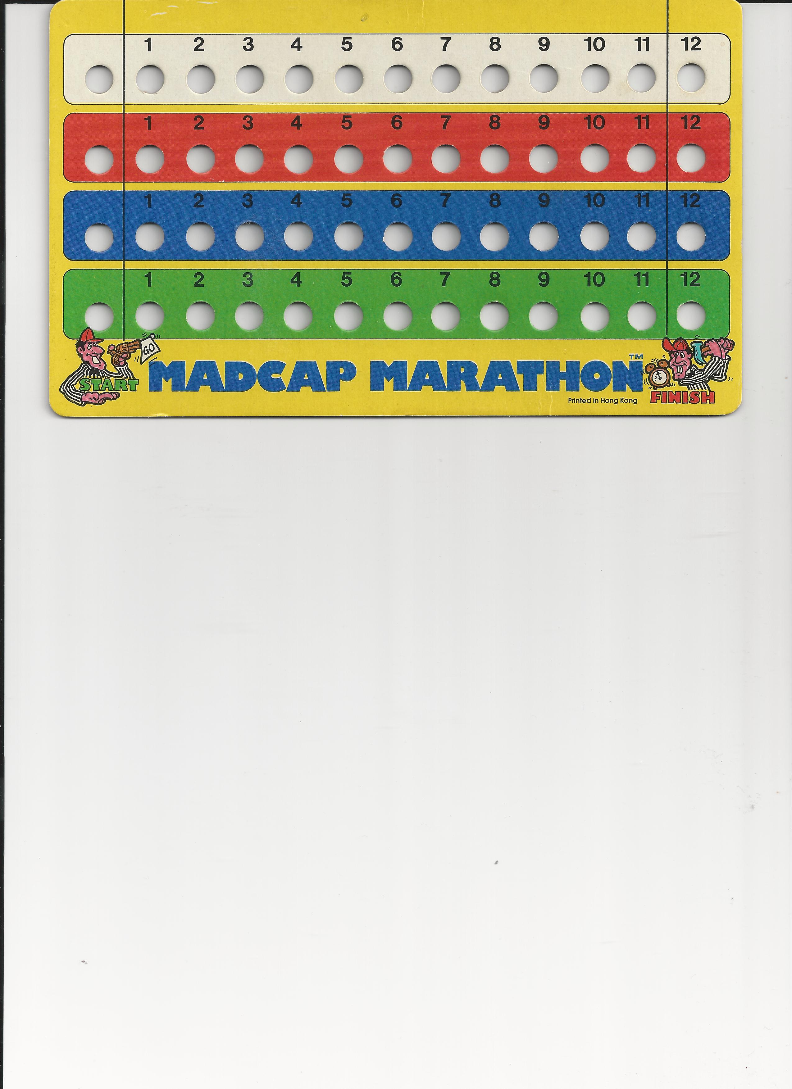 | Complete Games for Sale - click name to purchase (All games are previously played unless otherwise noted) Game Condition => Pricing Scale (click link above) # 11549 - 1981 MADCAP MARATHON game $19.95 Excellent Condition (nice game) # 00000 - 1981 MADCAP MARATHON game $17.95 Very Good Condition - Sold Out # 00000 - 1981 MADCAP MARATHON game $15.95 Acceptable Condition - Sold Out |