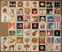 | 1 Plastic tray 108 Memory game cards 2 Apple cards 2 Apple half cards 2 Ball cards 2 Berries cards 2 Bird (sparrow) cards 2 Butterfly cards 2 Candle cards 2 Cardinal cards 2 Checkerboard cards 2 Church cards 2 Clown cards 2 Daisy cards 2 Diamond pattern cards 2 Duck cards 2 Fish cards 2 Flowers in bucket cards 2 Flowers in group cards 2 Flower (red) cards 2 Flower (Sun) cards 2 Fox cards 2 Girl black hair cards 2 Girl blonde hair cards 2 Girl brown hair cards 2 Horse cards 2 King cards 2 Lemon cards 2 Lion cards 2 Matches cards 2 Mouse cards 2 Orange "brain type" cards 2 Ornament (gold) cards 2 Ornament (yellow) cards 2 Owl cards 2 Twin owls cards 2 Peacock cards 2 People cards 2 Pineapple cards 2 Polka dot (black) cards 2 Polka dot (white) cards 2 Rabbit cards 2 Seashell cards 2 Ship cards 2 Ship close cards 2 Smoke stack cards 2 Strawberry cards 2 Stripes cards 2 Sun cards 2 Tiger cards 2 Tree (Pine) cards 2 Tree (Red flowers) cards 2 Tree (White flowers) cards 2 Triangle design cards 2 Veggies cards 2 Water lily cards Rules |