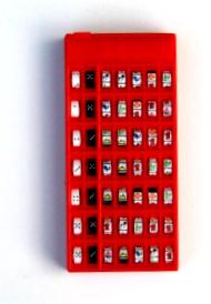 | 1 Plastic game unit 14 Number wheels 35 Character wheels Rules |