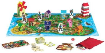| 1 Jigged gameboard 1 X Double spinner 4 Sack boards 9 3-D Buildings 4 Character pieces 4 Character stands 18 Action cards 56 Tokens 1 Windmill Sail 1 2-Part Rivet 1 Cloth Postbag 1 Standard 6-sided die 1 Instruction Leaflet 1 Consumer Leaflet |