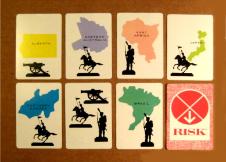 | 1 Bi-fold game board 6 Rectangle boxes 3 Red 6-sided dice 3 White 6-sided dice 480 Plastic game pieces 450 Army triangle pieces 75 Pink single pieces 75 Red single pieces 75 Yellow single pieces 75 Black single pieces 75 Green single pieces 75 Blue single pieces 30 Army tower pieces 5 Pink, 5 Red, 5 Yellow, 5 Black, 5 Green, 5 Blue 44 Cards (in sets) 1 Set of 9 North American 1 Set of 4 South American 1 Set of 6 African 1 Set of 7 European 1 Set of 12 Asian 1 Set of 4 Australian 2 Wild cards Rules |