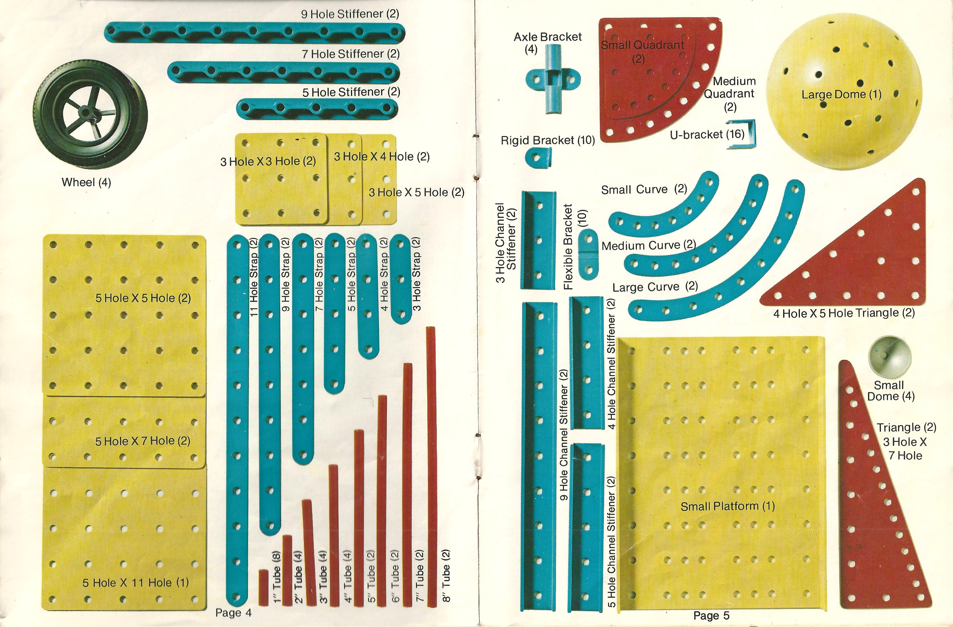 | 1 Plastic rivet tool 1 Styrofoam storage tray 4 Dome (small) 1 Dome (large) 1 Small Platform 2 9-Hole Channel stiffners 2 5-Hole Channel stiffners 2 4-Hole Channel stiffners 2 3-Hole Channel stiffners 140 Rubbery rivets 19 Plastic panels 2 "3 x 3 Hole" panels 2 "3 x 4 Hole" panels 2 "3 x 5 Hole" panels 2 "5 x 5 Hole" panels 2 "5 x 7 Hole" panels 1 "5 x 11 Hole" panel 2 Small quadrant panels 2 Medium quadrant panels 2 "4 x 5 Hole" triangle panels 2 "3 x 7 Hole" triangle panels 2 "9 Hole" stiffeners 2 "7 Hole" stiffeners 2 "5 Hole" stiffeners 2 "11 Hole" straps 2 "9 Hole" straps 2 "7 Hole" straps 2 "5 Hole" straps 2 "4 Hole" straps 2 "3 Hole" strap 2 "8 Inch" tubes 2 "7 Inch" tubes 2 "6 Inch" tubes 2 "5 Inch" tubes 4 "4 Inch" tubes 4 "3 Inch" tubes 4 "2 Inch" tubes 8 "1 Inch" tubes 2 Large curve pieces 2 Medium curve pieces 2 Small curve pieces 4 Axle brackets 10 Flexible brackets 10 Rigid brackets 16 U-Brackets 4 Plastic wheels 4 Plastic small domes Instruction booklet |
