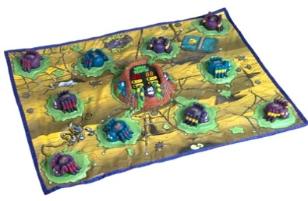 | DESCRIPTION - from the game The game mat has 10 spiders which light up in sequence simulating that they are moving away from the nest and towards the outside of the game mat. All games begin with the spiders lighting up solid red near the center nest. If this center spider is not stomped in time, it will turn off and one of the spiders on the mat's outside edges will blink red. If this outside spider turns off before being stomped, the spider has escaped off the mat, and you will hear it bite you. |