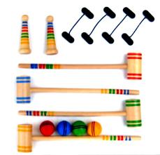 1 Wooden box 1 Wooden sliding box lid 9 Metal wickets 2 Wooden posts 4 Wooden mallets (8") ! Red mallet 1 Blue mallet 1 Green mallet 1 Yellow mallet 4 Wooden balls (1") 1 Red ball 1 Blue ball 1 Green ball 1 Yellow ball Rules |