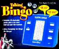 DESCRIPTION - from the game Catch the excitement as Talking Bingo calls out each number in a strong, clear voice. B-9, G-53...BINGO! You win! Small enough for ultra-portability, yet with a large LCD screen that is easy to read. The new Talking Bingo is great for family games night or for playing with all your friends. Comes with everything you need to play a fun game of bingo. Uses 3 AAA Batteries (not included) See 1995 Talking Bingo Electronic game Radica |