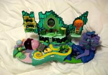 DESCRIPTION Shipping Wt: Approx. 2.5 lbs. The Polly Pocket Wizard of Oz Set has several exciting action features: 1) press a bush button and light up Glinda's bubble, the crystal ball in the Witch's castle tower and the sconces on both sides of the Wizard's throne, 2) a removable Omaha State Fair balloon, 3) two opening doors to the Emerald City throne room, 4) a swinging pendulum inside of the Emerald City, 5) a control room curtain that opens, 6) a storage door that opens to reveal a heart, medal and diploma, 7) a lever that moves a flaming Wizard picture in the throne room, 8) two pivoting base sections that widen the main base, 9) a dial to spin Glinda's bubble, 10) a lever that opens the blue-thatched roof of a house which raises a red platform for the Wicked Witch, 11) a lever on the Witch's castle to show the melted witch and 12) a back door to the castle that opens as a slide to for the melted witch. |